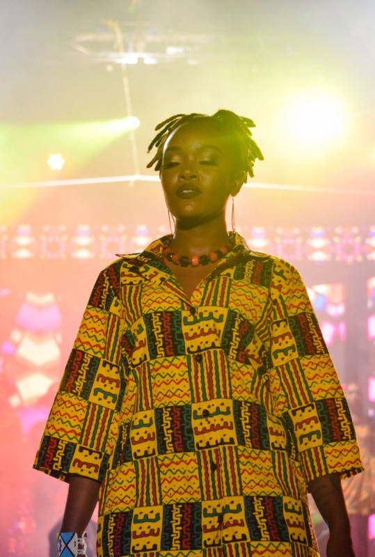 Jasmin Mwangi from Nakuru wearing a gorgeous Yellow Kente Dress Top by Vaa Leo Nairobi , accessorised with Short Coloured Necklace by Pacho Safe Siaya and coupled with styled Brass Earrings by the Munyulis Enterprise Nairobi and unique Beaded Bracelet by Omwando Beaded Collection Malindi