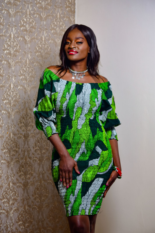 Jungle Green Spandex outdoor Dress from Nairobi coupled with Brass Beaded Chocker from Kajiado and Round Beaded Bangle from Mombasa
