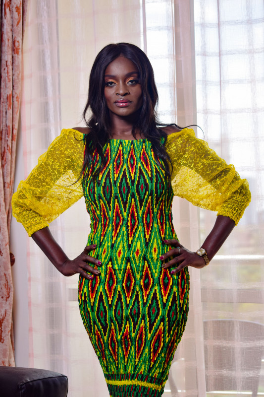 Elegant Ankara Spandex Kente Dress With Yellow Organza Sleeves Paired With Matching Yellow Beaded Earrings.
