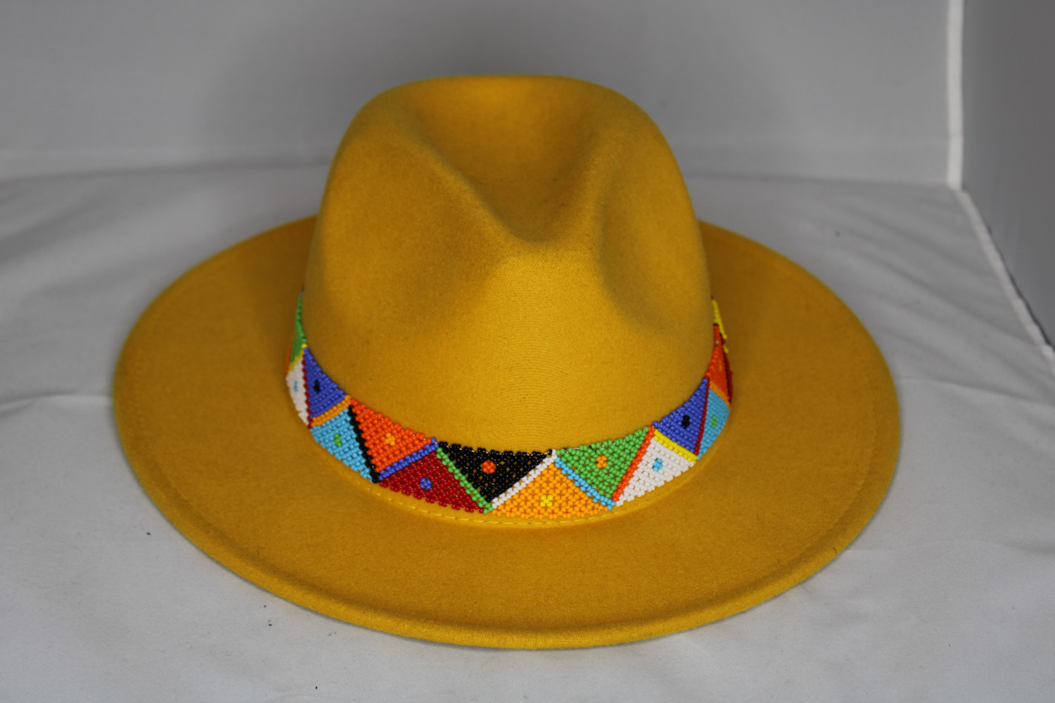 Elegant Mustard Fedora Hat With Multi-Colored African Beaded Band