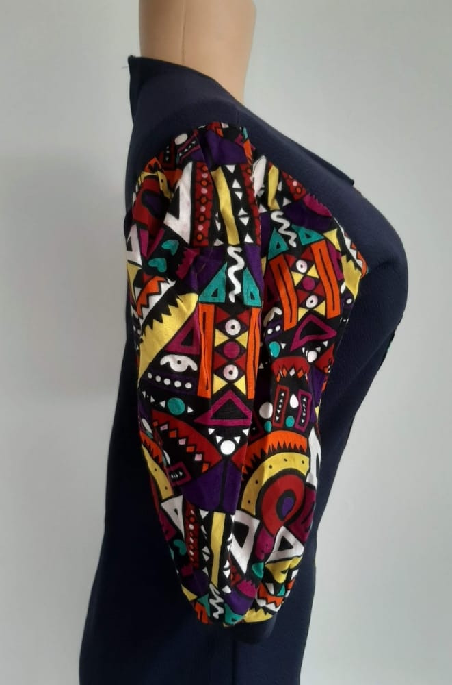 Navy Blue Plain Fabric Dress With Front Ankara Patch